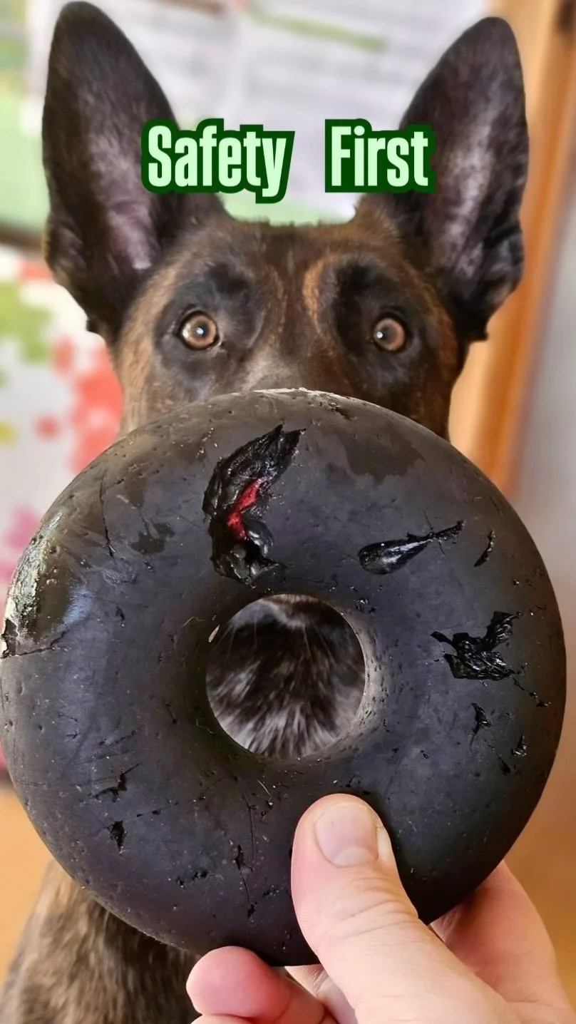 Goughnuts Safety Guarantee applies to all of our products, but the colored rings are the only toys that have the red indicator. (The new Heavy Duty items do not have the safety indicator but are still guaranteed) Our rings should be used for supervised power chewing. Our stick, ball, WORK TO EAT, K9 kup, flynut, and tug should be considered interactive play toys versus constant or power chewing. If any of our products are damaged please follow our Safety Guarantee Policy as a mechanism to get your dog a safe undamaged Goughnut. Sizing is very important. Bigger dogs need bigger diameter cross sections to help eliminate scissor like chunks that are the primary reason for intestinal blockage. Please always be conservative and present products that exceed the width of your dogs mouth.